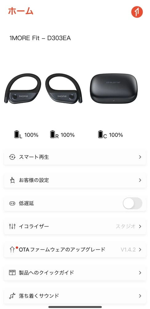 ▼アプリ画面。イヤホンの充電残量や接続状態、音質に関する各種パラメータの調節などを行うことが可能。