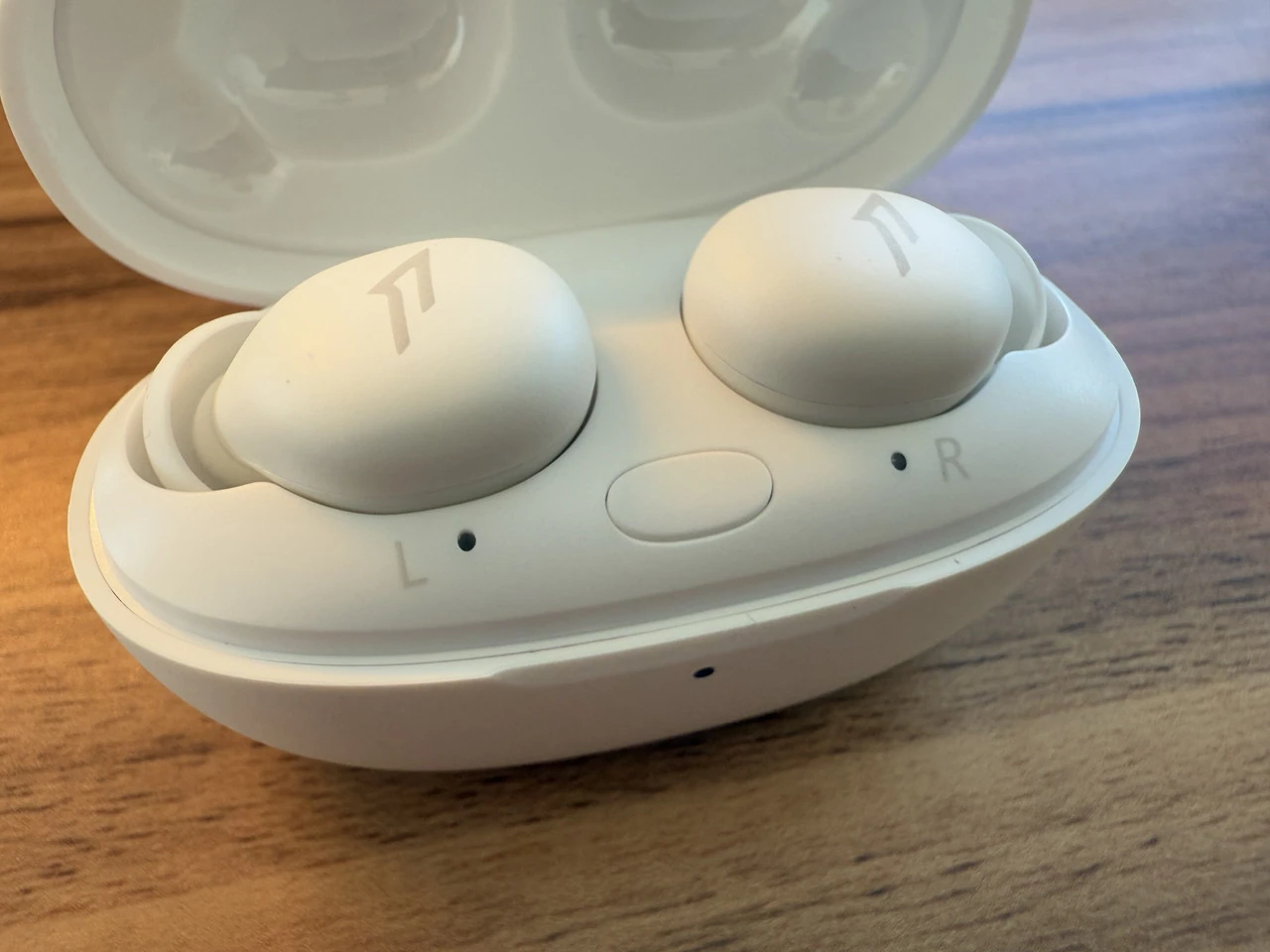 ▼ケースには左右のイヤホンがスッポリと収まっているほか、中央にはペアリング等に使用するペアリングボタンが用意。