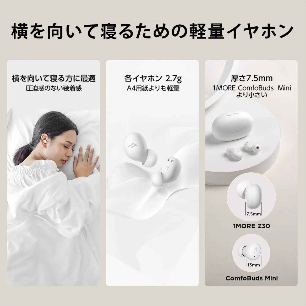 睡眠時に使用可能な "睡眠用イヤホン"(通称:寝ホン)としてリリースされたモデルであり、旧機種の「1MORE ComfoBudsZ」と「1MORE ComfoBuds Mini」と同様の超小型サイズを実現しつつ、バッテリー持続時間を2倍以上に改良した最新モデルとなっている。