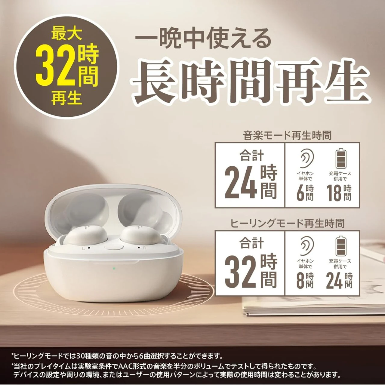 ▼ヒーリングモード(イヤホン+ケース単体)では最大32時間もの連続使用が可能。