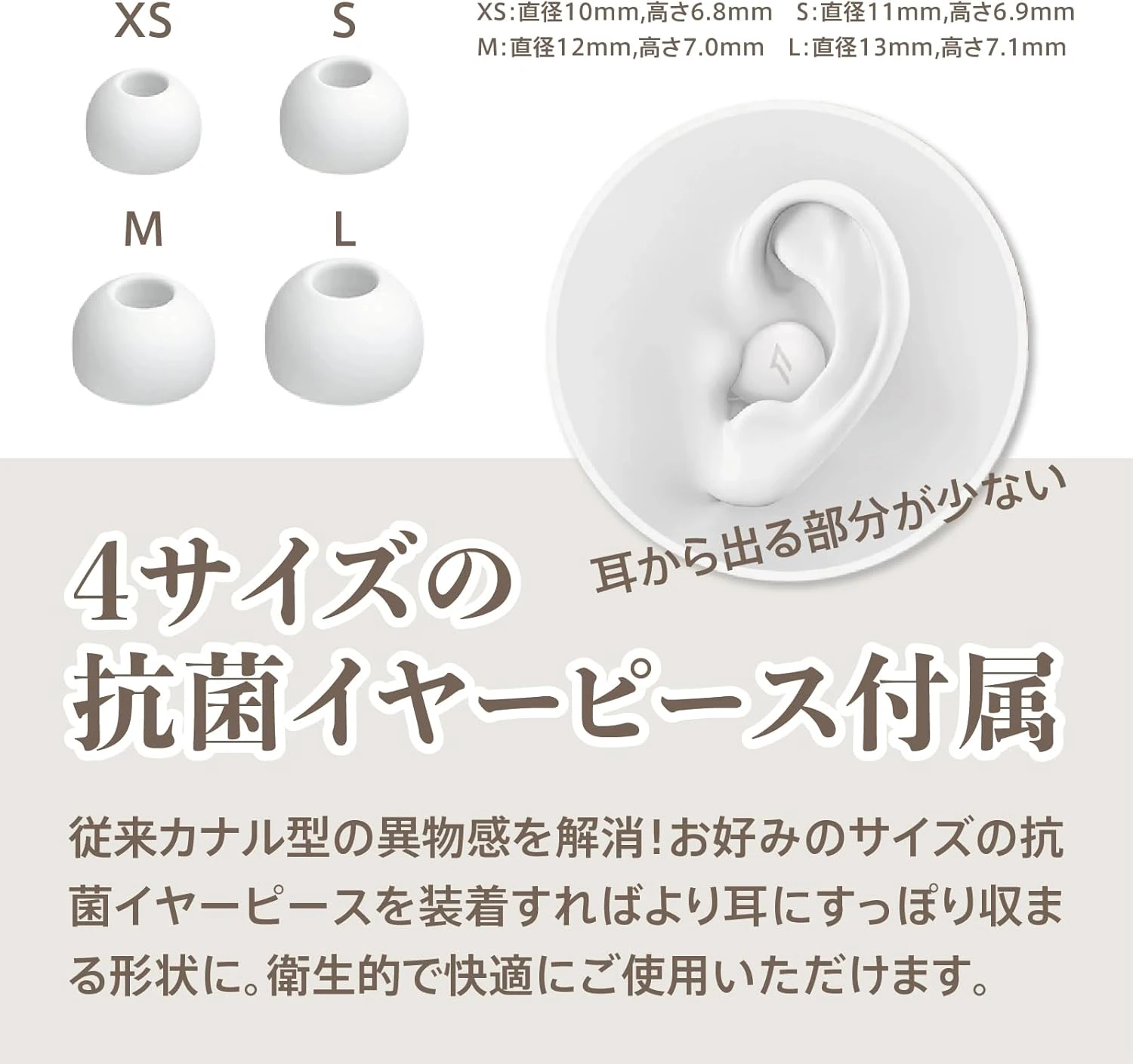 | イヤーピースサイズ | ・XS:直径10mm, 高さ6.8mm ・S:直径11mm, 高さ6.9mm ・M:直径12mm, 高さ7.0mm ・L:直径13mm, 高さ7.1mm |