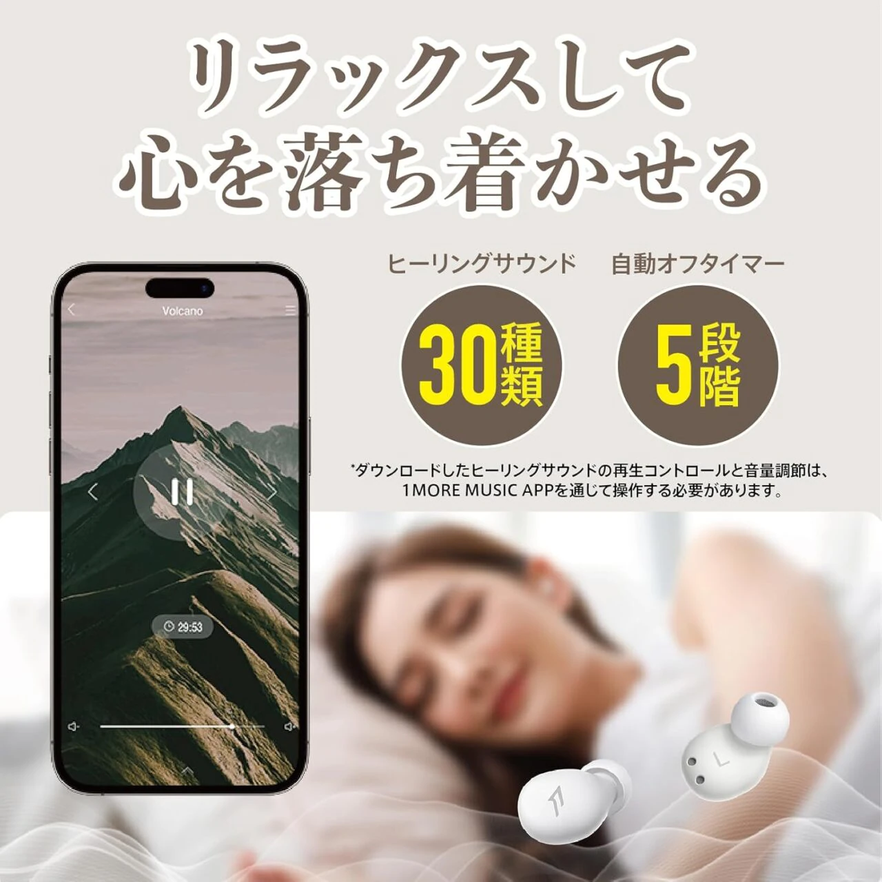 1MORE Z30は、スマホ等のデバイスと連携して好みの楽曲を再生できる「音楽モード」と、1MORE MUSICアプリ内のヒーリングミュージックを再生できる「ヒーリングモード」を選択できる。睡眠時だけでなく、一般的なワイヤレスイヤホンと同様の利用方法も可能だ。