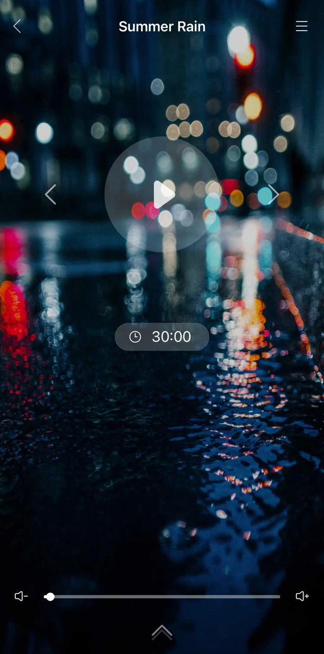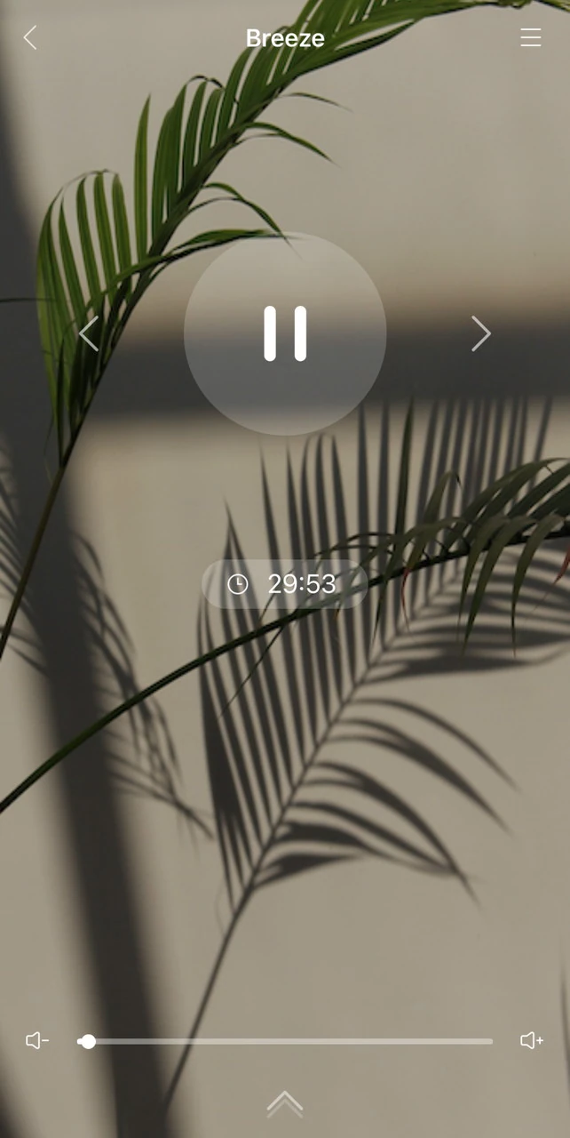 ヒーリングミュージックのボリューム(音量)操作はデバイスから独立しており、再生画面上で細かく調整できる。