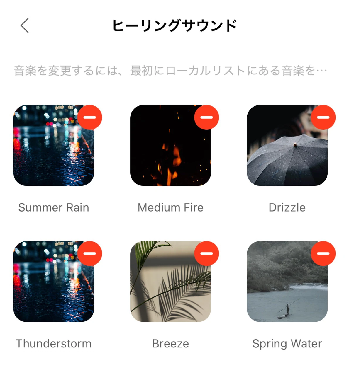 ヒーリングミュージックには「Summer Rain(夏の雨)」「Midium Fire(中火)」「Drizzle(霧雨)」「Tunderstorm(雷雨)」「Breeze(風)」「Spring Water(湧き水)」などが用意されており、バリエーション豊かなアンビエントノイズを楽しめる。