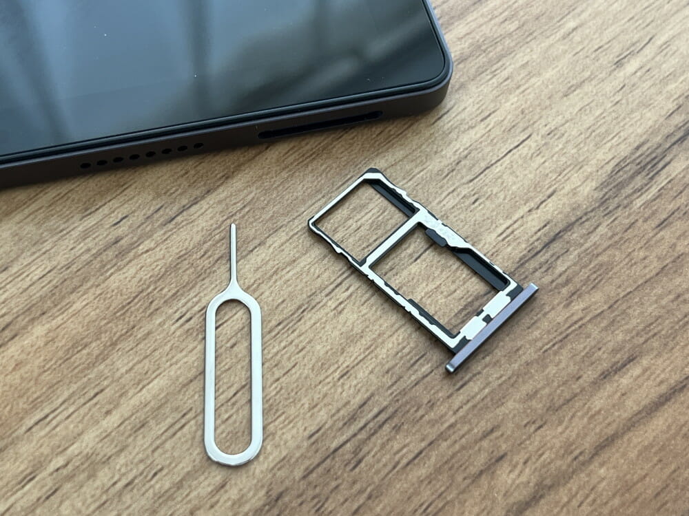 ▼付属のピンを用いてスロットを開き、nanoSIMカードやマイクロSDカードを挿入することが出来る。