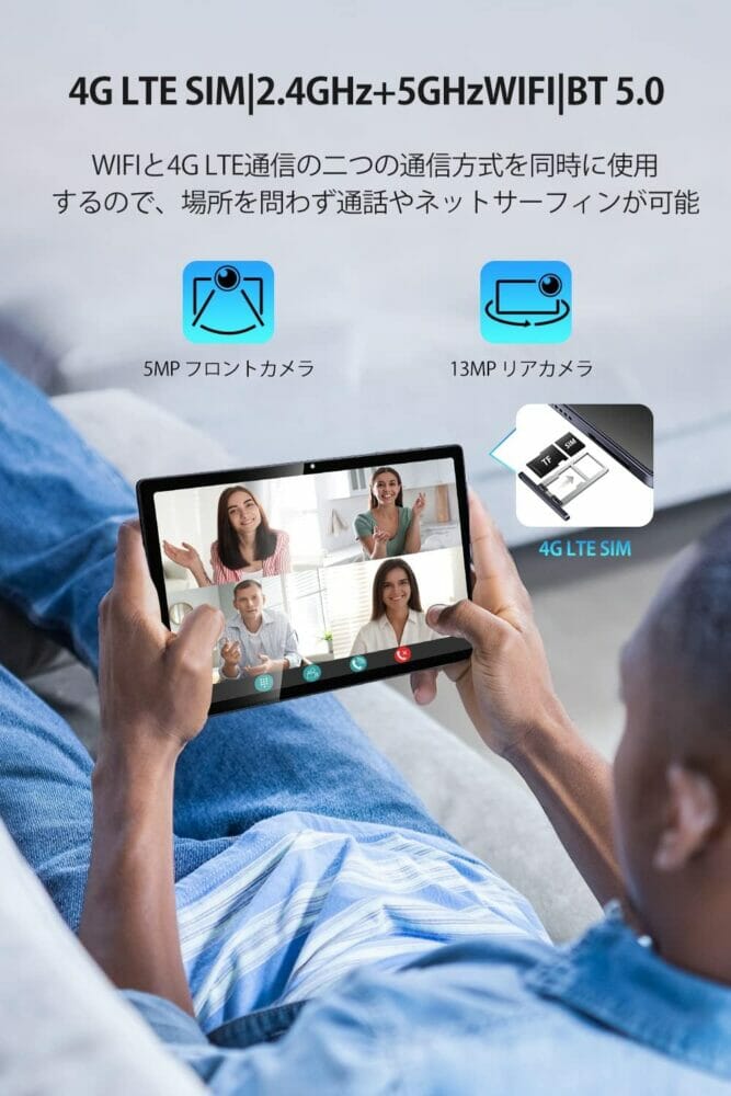 通信規格はデュアルバンドWi-Fi、Bluetooth5.0、4G LTE、GPSに対応。デュアルnanoSIMカードの挿入に対応しており、外出先でも4G LTEモバイル通信を行うことが出来る。