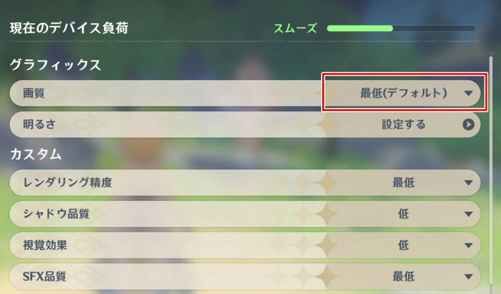 ▼画質設定はデフォルト状態で "最低" に設定されており、デバイス負荷は "スムーズ" の状態。