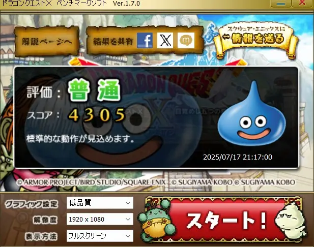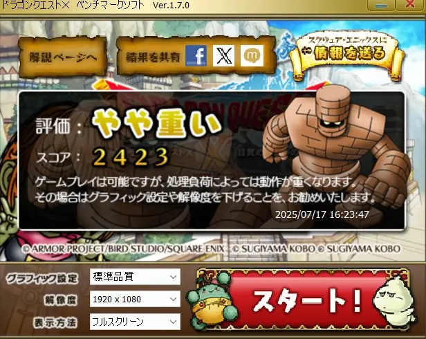 フルHD解像度・フルスクリーンでテストを実行したが、標準品質の場合は2,423点で「やや重い」、低品質の場合は4,305点で「普通」という結果となった。