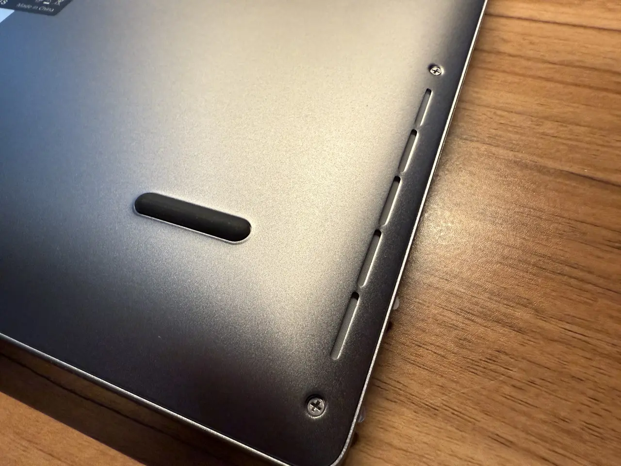 ▼PC底部はやや熱を持つものの、決して高音ではない。ただ低音ヤケドの危険もあるため、膝上へ直に置いて長時間使用するのは避けた方が良いだろう。