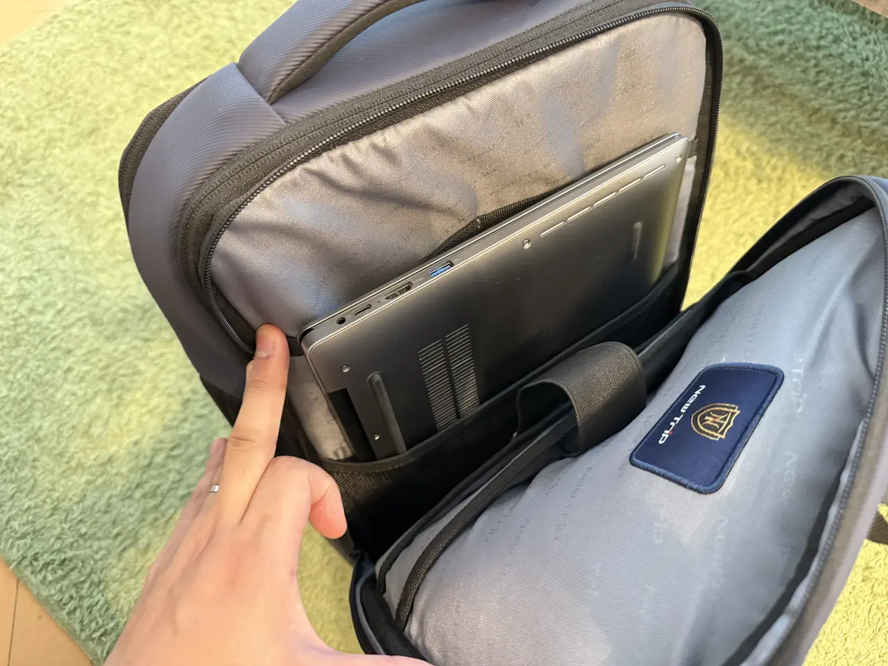 一般的なビジネスリュックにも難なく入る。ノートPC用のカバンを別途用意する必要がないため、手持ちの荷物を減らすことができて嬉しい。