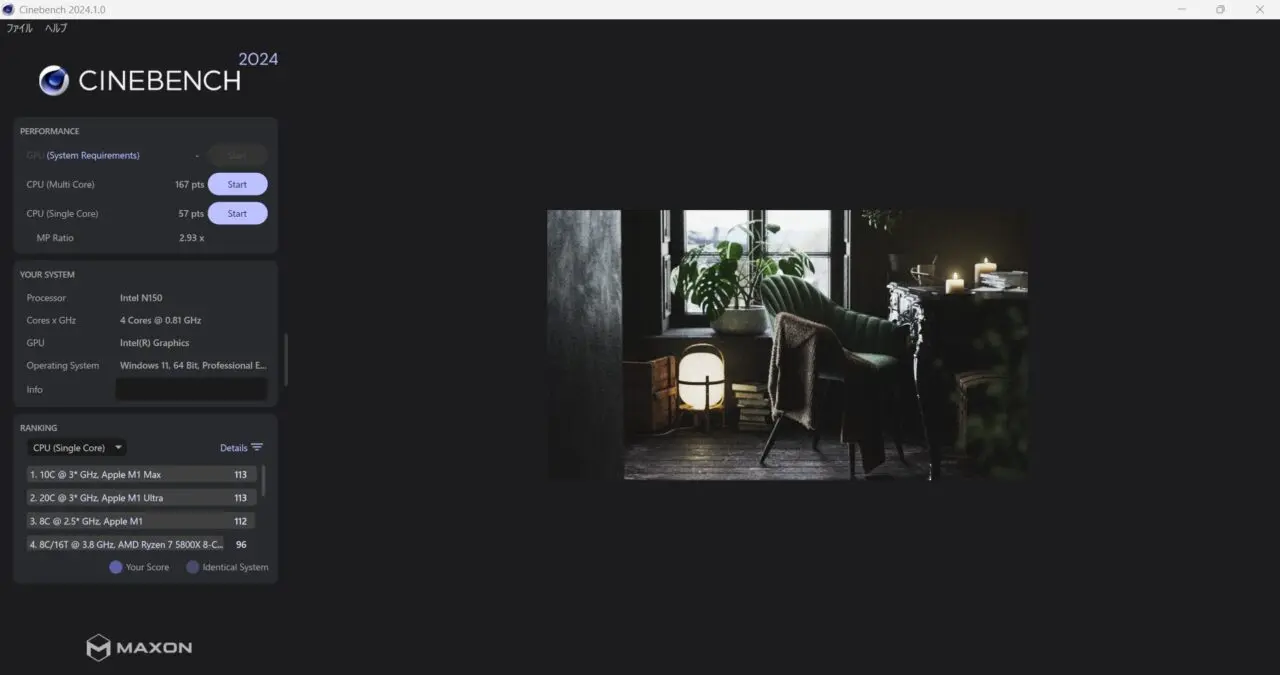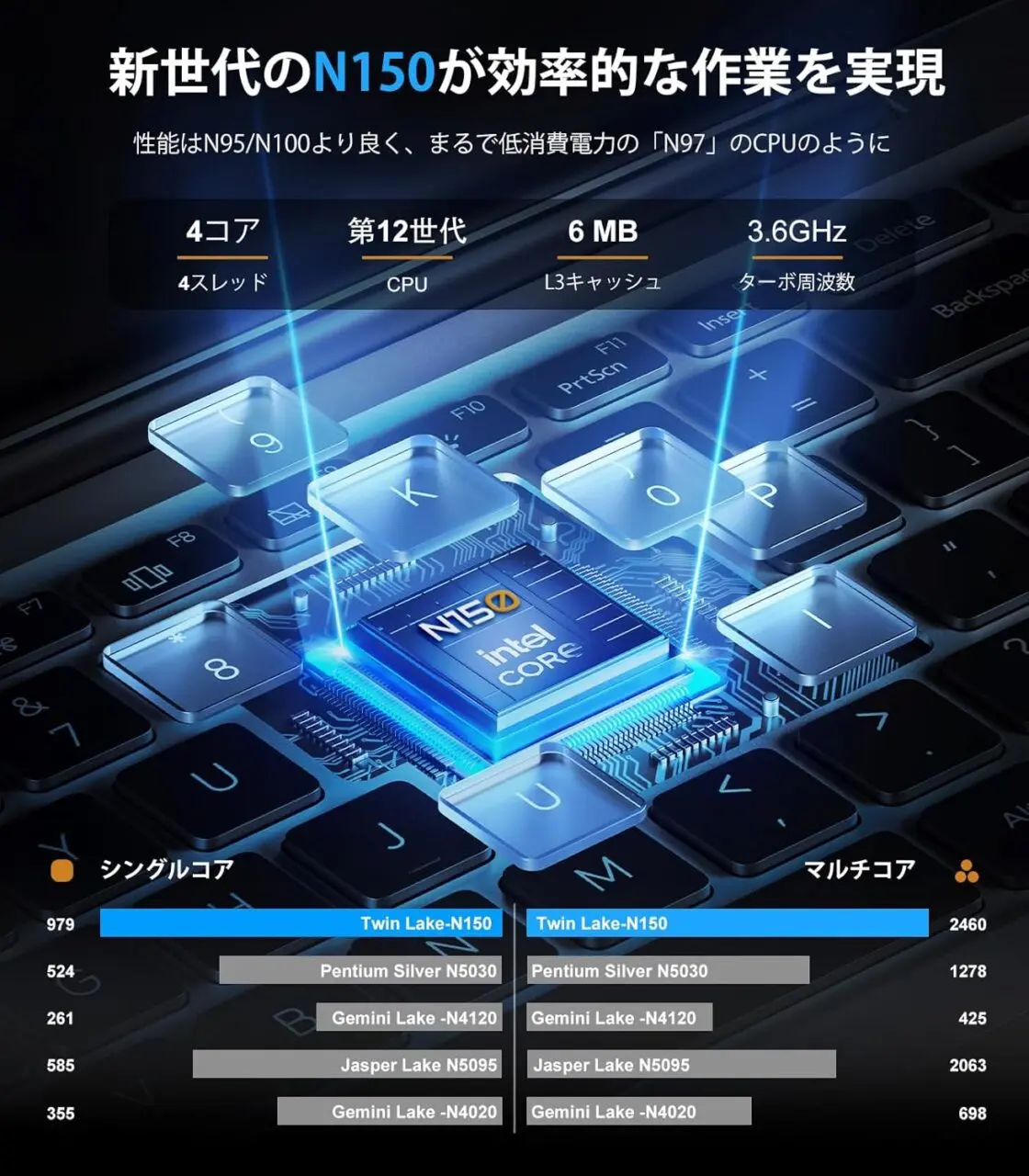 CPUにはIntel Twin Lake N150を採用。グラフィック処理用にはIntel UHD Graphics 24EUを備えており、一般的なPC作業(ウェブサイト閲覧や動画視聴)はもちろん、様々なアプリケーションを使用したオフィスワークまで、幅広い用途で活躍できる性能を備えている。