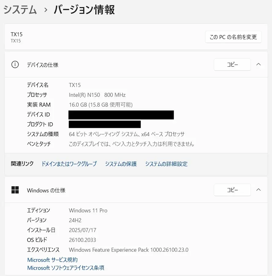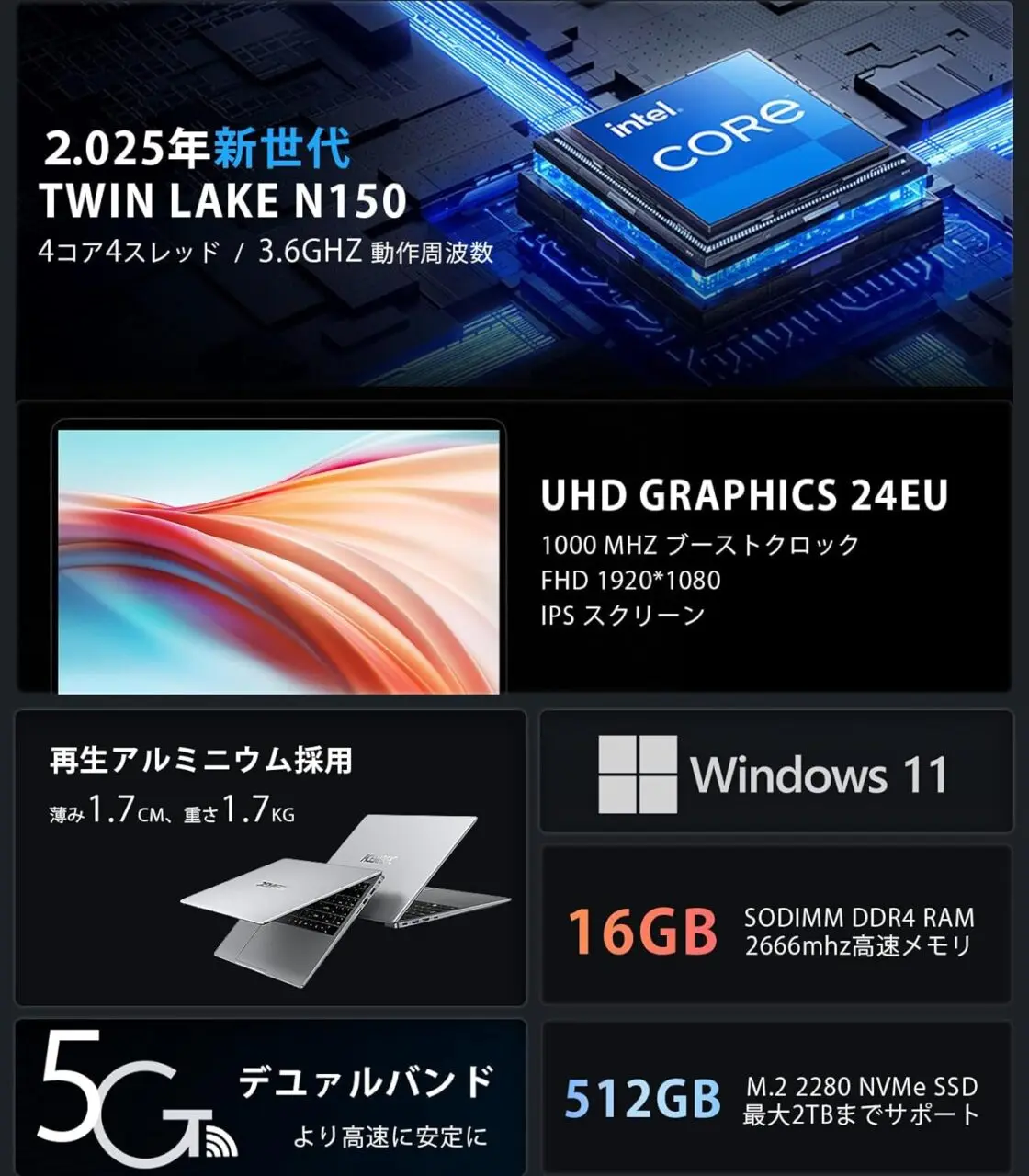 CPUにはIntel Twin Lake N150を、グラフィック処理にはUHD Graphics 24EUを採用。16GB RAMと512GB SSDを備えるほか、カメラ&マイクを内蔵しており、一般的なビジネス用途から軽めのゲームまで、幅広い用途で活用できるモデルとなっている。