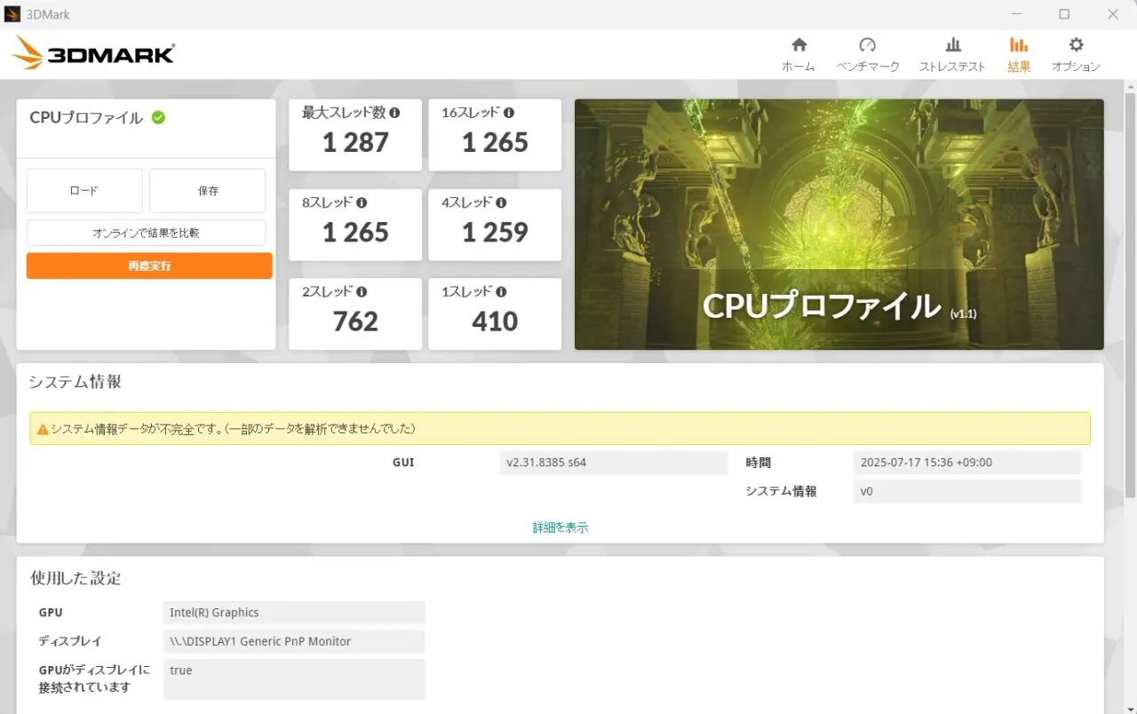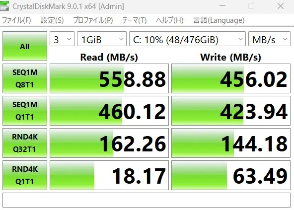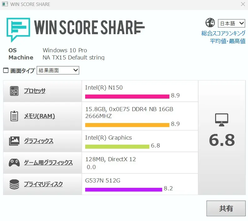 上記の条件でベンチマークテストを行った結果、スコア1,853点、評価は "設定変更が必要" であった。