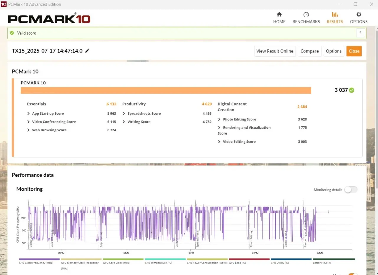 PCMARK10(有料版)のテスト結果は以下の通りとなった。