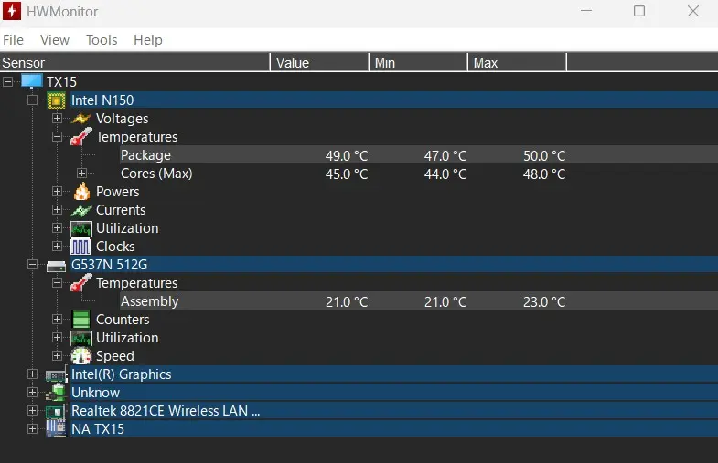 CPU温度に関しては最高でも50℃に収まっており、非常に安定している。ストレージ温度も低温を保っており、パフォーマンスへの影響はまったく体感できなかった。ウェブ閲覧や軽作業中の温度としては適正で、排熱設計は十分。夏場でも安心して使えるレベルだ。
