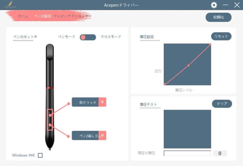 ▼ペンのファンクションボタンに機能を割り当てたり、筆圧の調整を行うことが可能。