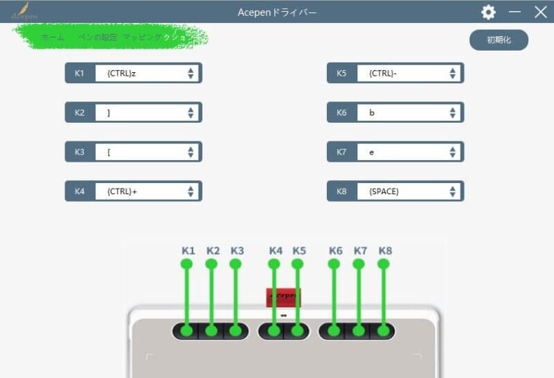 ▼ペンタブ上部の各ファンクションボタンに対し、好みの機能(キー)を割り当てることも出来る。