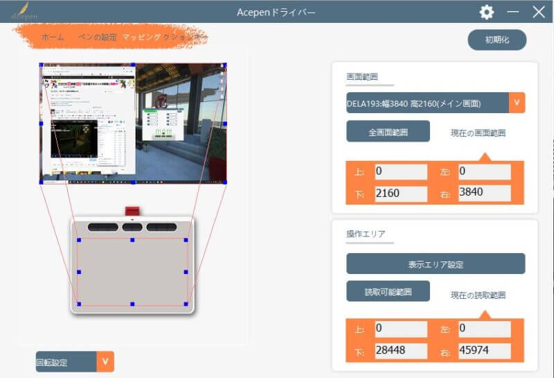 ▼また、ペンタブが反応するディスプレイ上の範囲を好みに指定することも可能だ。