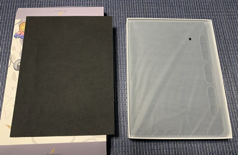 ▼ペンタブの下には付属品一式が収まっている。