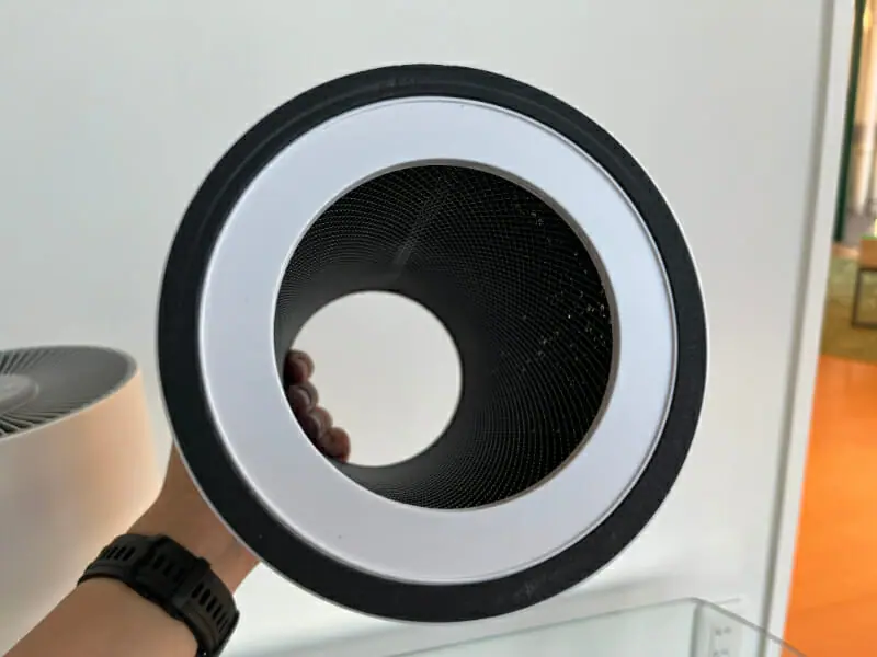 室内の空気を360 °から取り込む円筒型のデザインで、空気の汚れを全方位で逃さず浄化することが可能。四方から吸い込んだ空気が3層構造フィルター(プレフィルター、H13 HEPAフィルター、活性炭脱臭フィルター)を通過することで、有害物質を確実に除去する。ペットのフケ(80μm)、花粉(30μm)、PM2.5(2.5μm)などはもちろん、0.1µmまでの微細粒子も99.9%除去し、一台で集じん・脱臭・除菌を実現することができる。