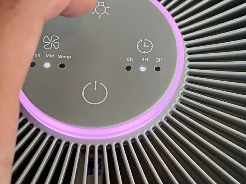 電源コード接続後、製品上部の電源ボタン、もしくは付属リモコンの電源ボタンをタッチすることで吸気口が点灯し、吸気が開始される。