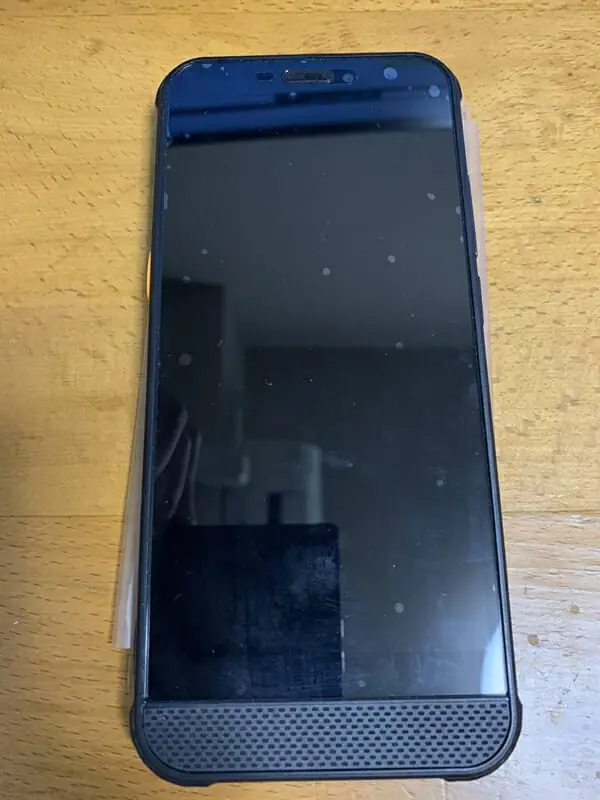 ▼スマホ本体外観。結構ゴツくて大きい。購入時にはディスプレイに保護フィルムが貼られている。