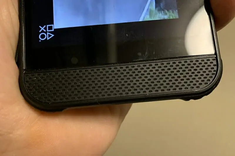 ▼下部にはスピーカーを1基搭載。また筐体の四隅には衝撃を抑えるための設計がなされており、手持ち位置から落下させてしまった場合でも壊れづらくなっている。