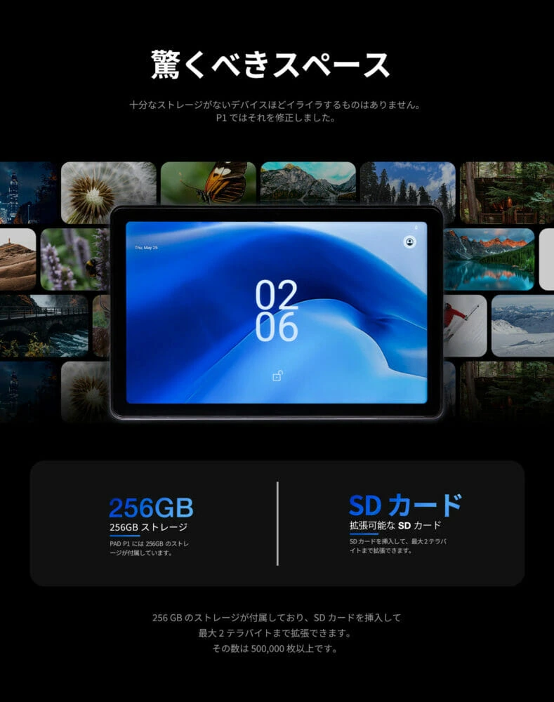 ストレージは256GBを用意。多くのデータやアプリを保存しておくことができ、必要に応じてマイクロSDカードを挿入することで最大2TBまでの拡張も可能だ。