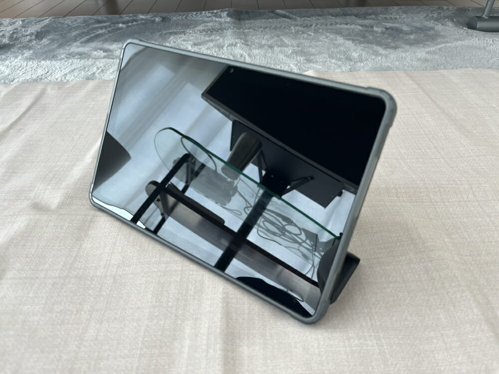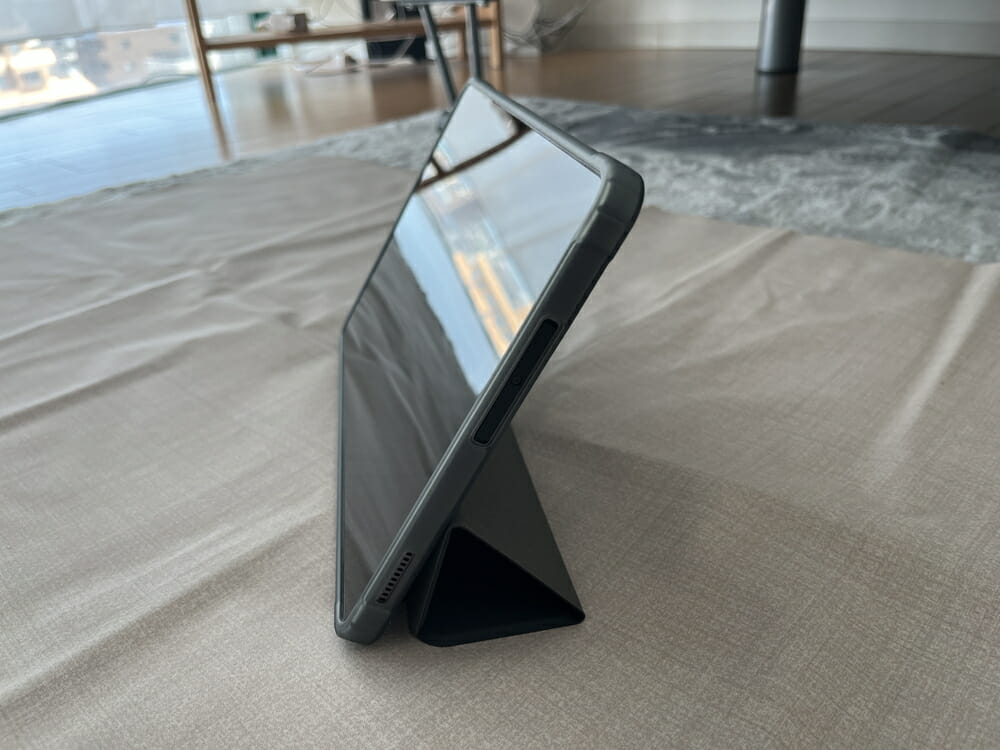 ケース背面を折りたたむことで、タブレットを立て掛けて設置することも可能だ。