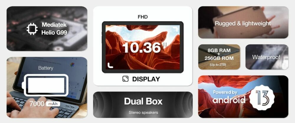 CPU(SoC)にはMediaTek Helio G99を採用。AnTuTuベンチマークテストで40万点超えのスコアを記録するほどの性能を擁する一方で、IP68/69K規格の高度な防水防塵性能を実現。そして頑丈な筐体に対してスタイリッシュなデザインのAndroidタブレットとなっている。