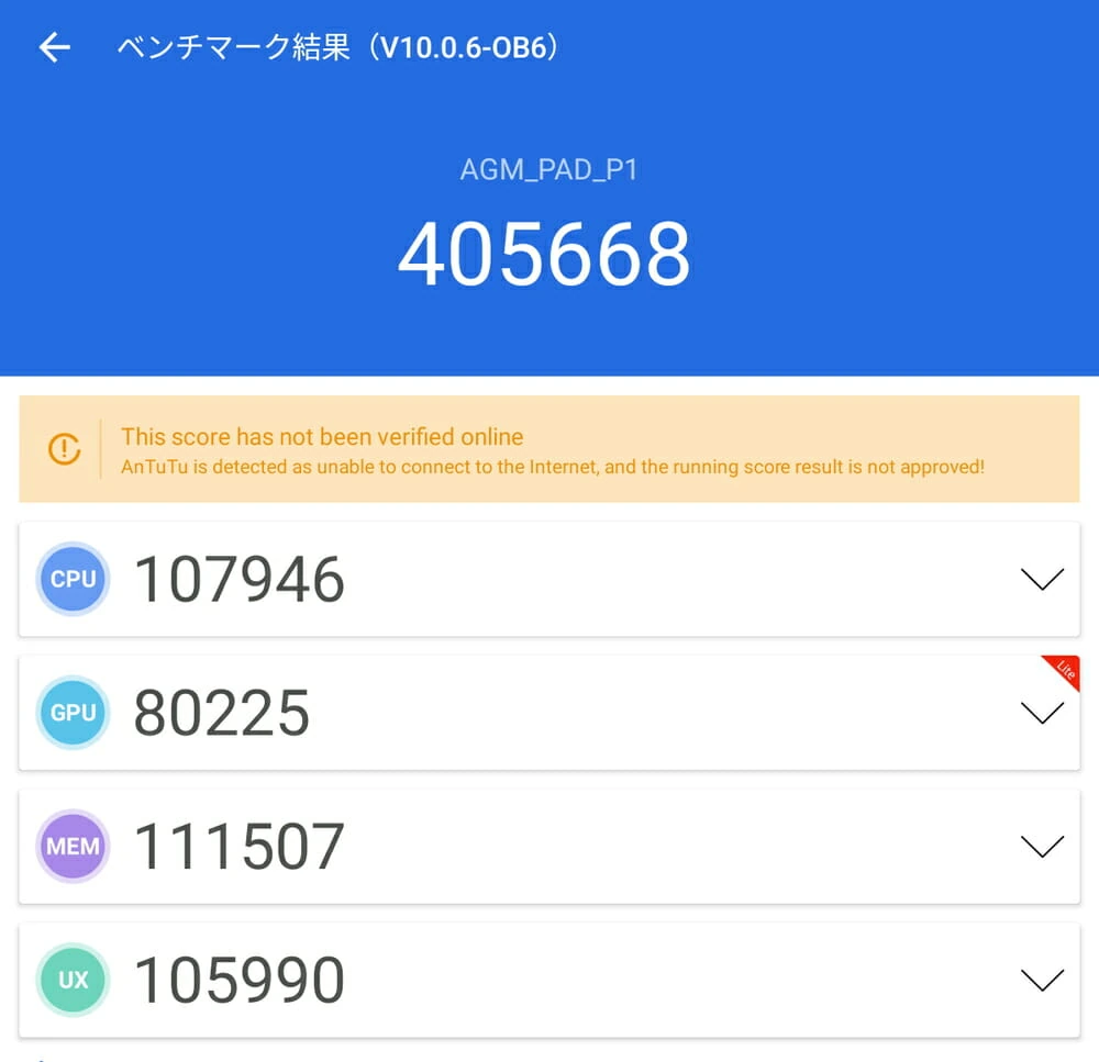 本機について、スマホ・タブレット端末の性能を測ることのできる『AnTuTuベンチマークテスト』を実施してみた。