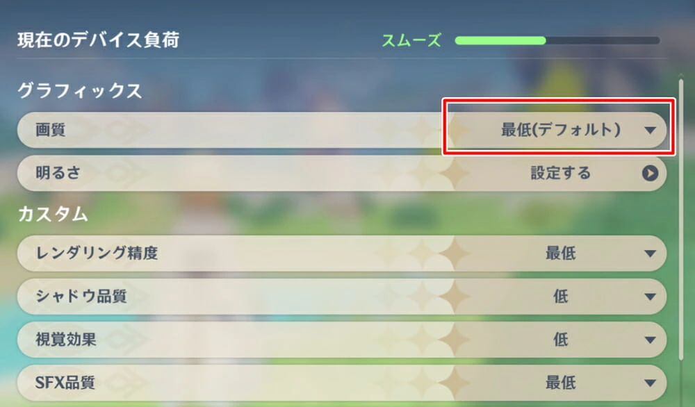 ▼画質設定はデフォルト状態で "最低" に設定されており、デバイス負荷は "スムーズ" の状態。