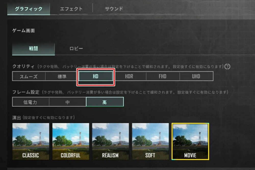 まずグラフィッククオリティに関しては『HD』まで選択できた。
