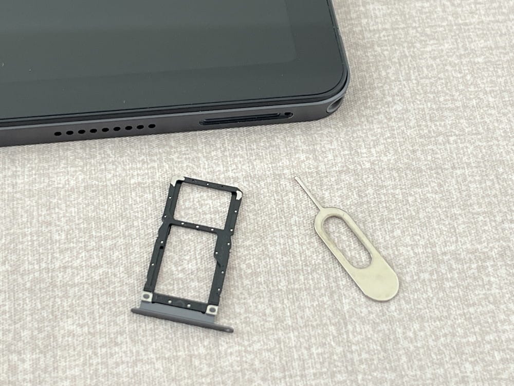 ▼付属のピンでカードスロットを開き、デュアルnanoSIMカード、もしくはマイクロSDカードを挿入できる。