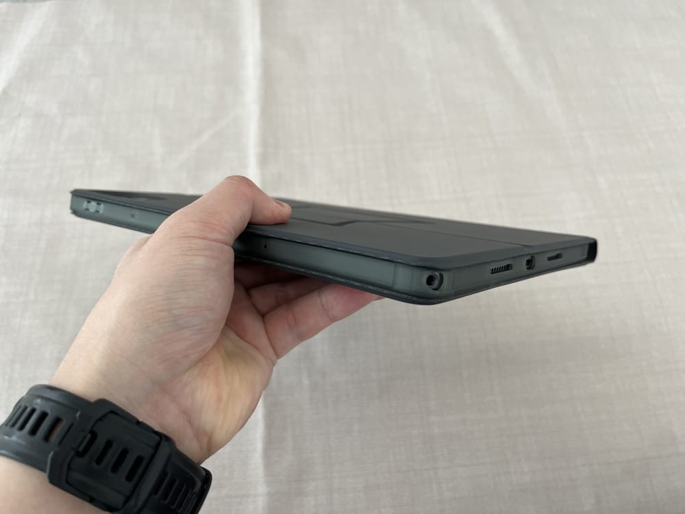 筐体は薄型かつスタイリッシュな見た目で、そこそこの高級感も感じられるデザインとなっている。本体重量は約530gとややズッシリ感はあるものの、長時間持ち続けてもそこまで腕が疲れることは無い。