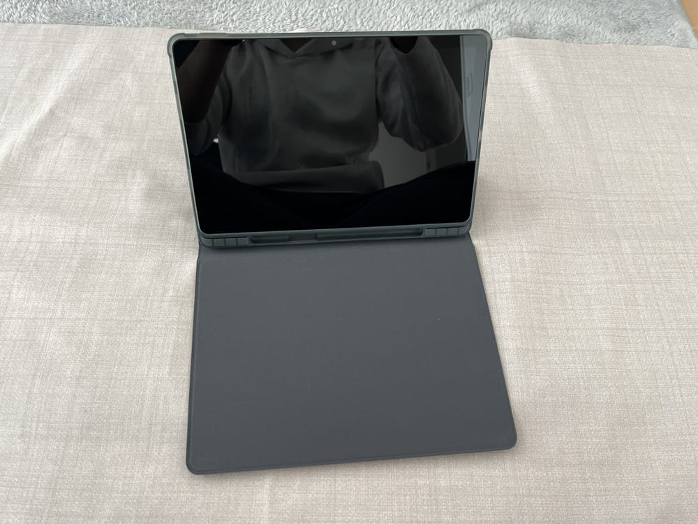 ケース背面のスタンドを立てることで、タブレットを立て掛けて設置することも可能だ。