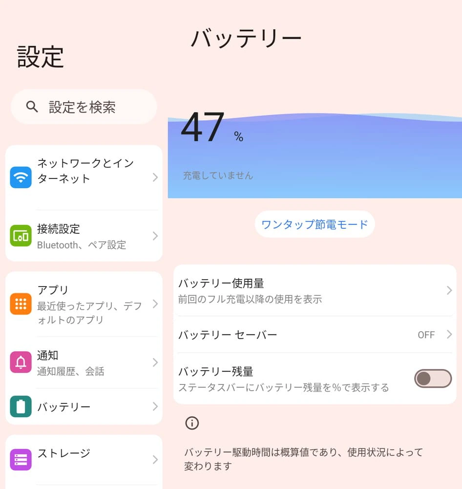 ▼ウェブサイト閲覧や動画視聴で計10時間程度、連続使用した状態のバッテリー残量。