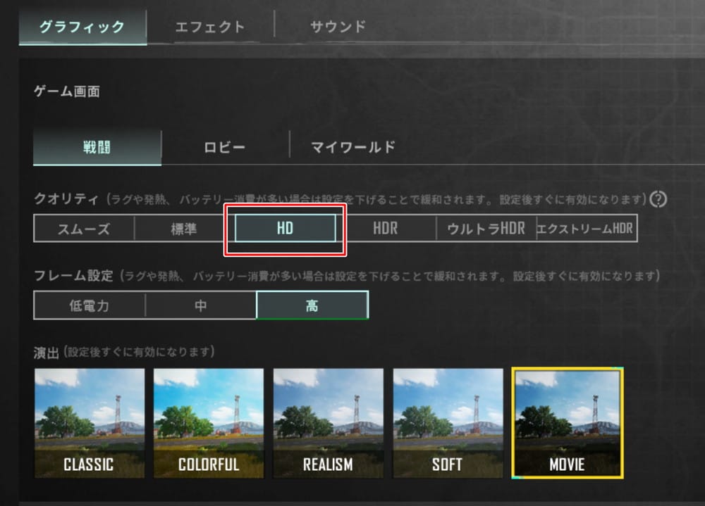 まずグラフィッククオリティに関しては『HD』まで選択できた。