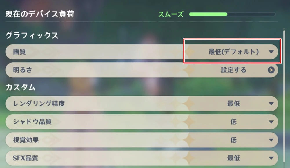 ▼画質設定はデフォルト状態で "最低" に設定されており、デバイス負荷は "スムーズ" の状態。