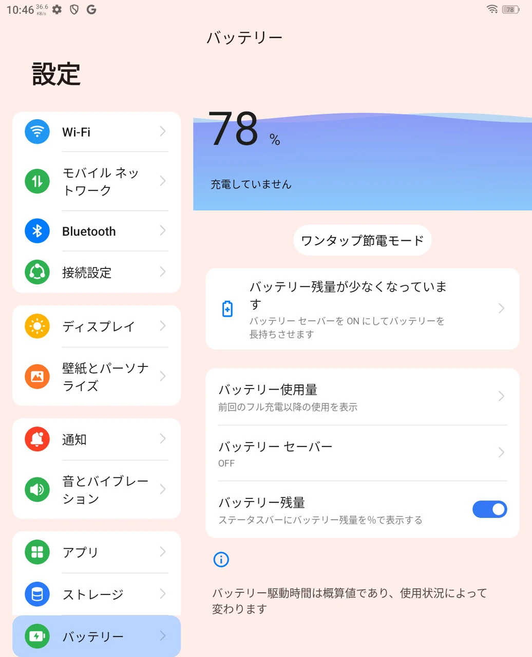実際に使用してみたところ、動画視聴、ウェブブラウジング、少々のゲームアプリ起動などを日中に行ってみたが、2日間(計12~13時間ほど)は充電なしでも利用し続けることが可能であった。
