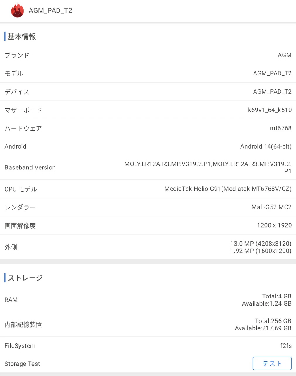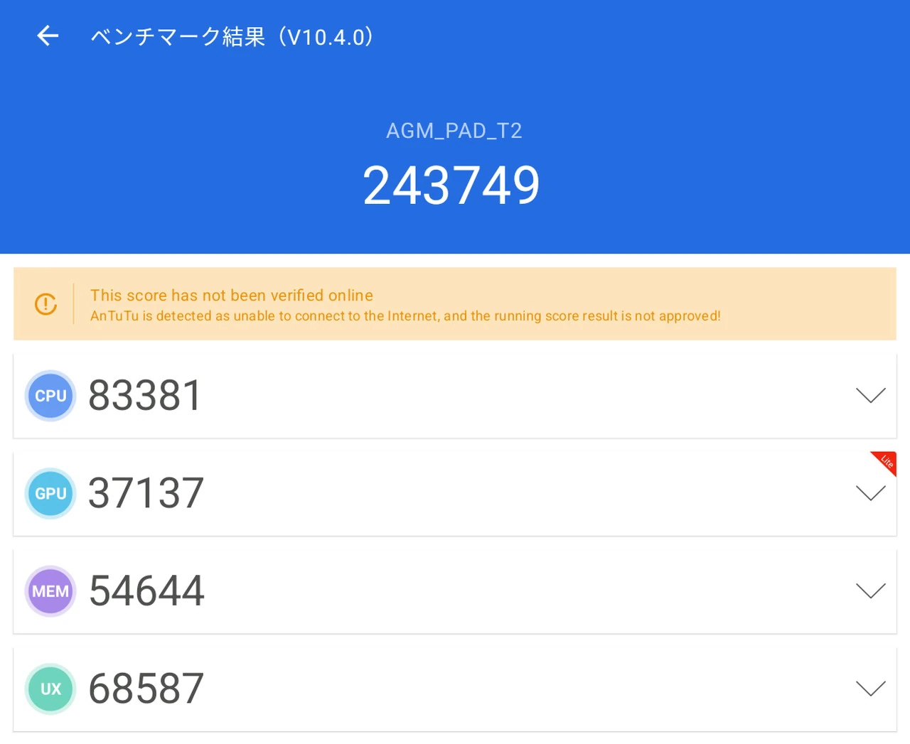 2万円前後のタブレットとしては、そこそこ高いスコアだと言える。前機種「AGM PAD T1」の約23.4万点よりも、スコアが若干向上している。