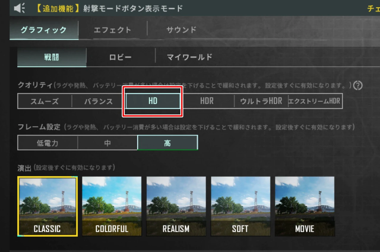 まずグラフィッククオリティに関しては『HD』まで選択できた。