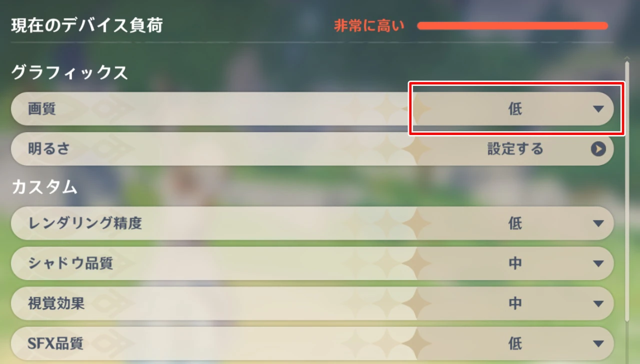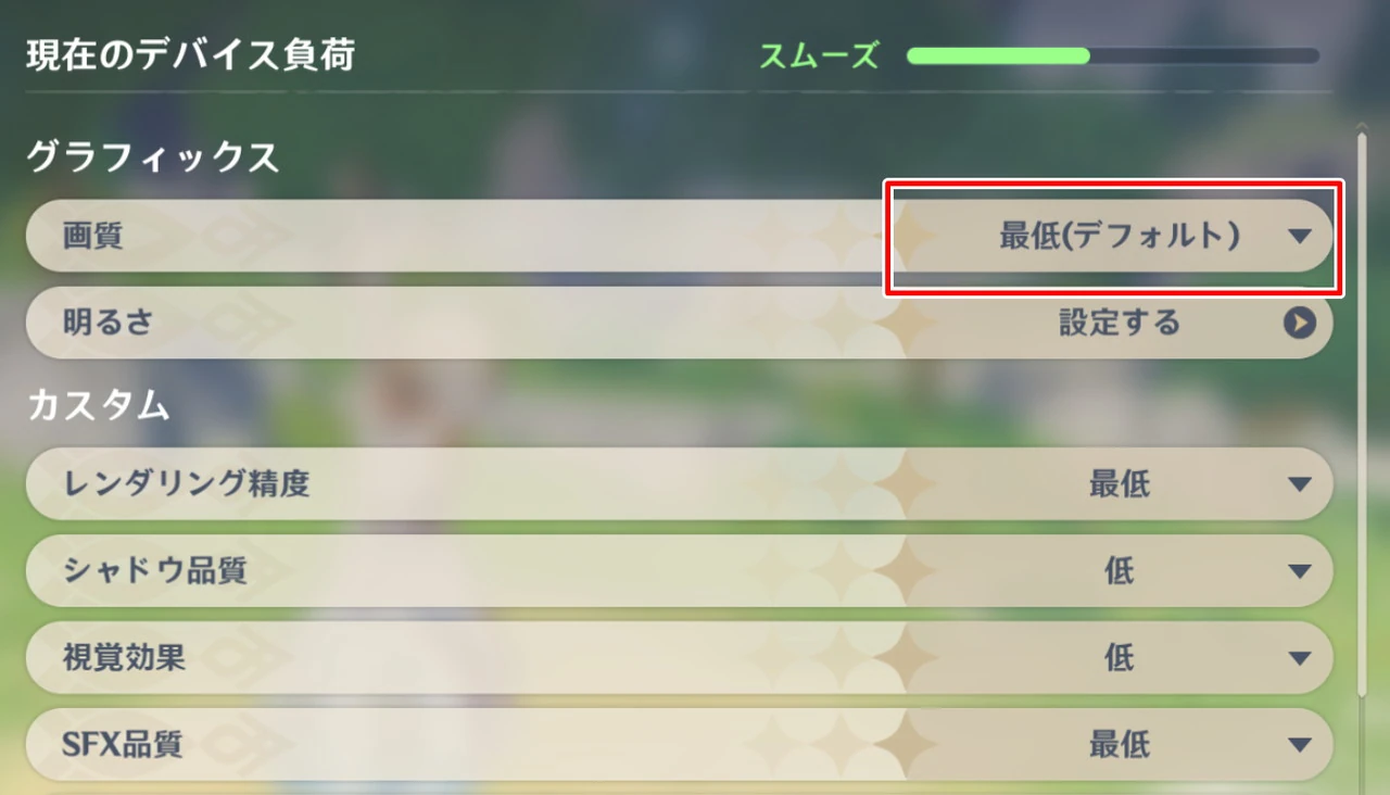 ▼画質設定はデフォルト状態で "最低" に設定されており、デバイス負荷は "スムーズ" の状態。