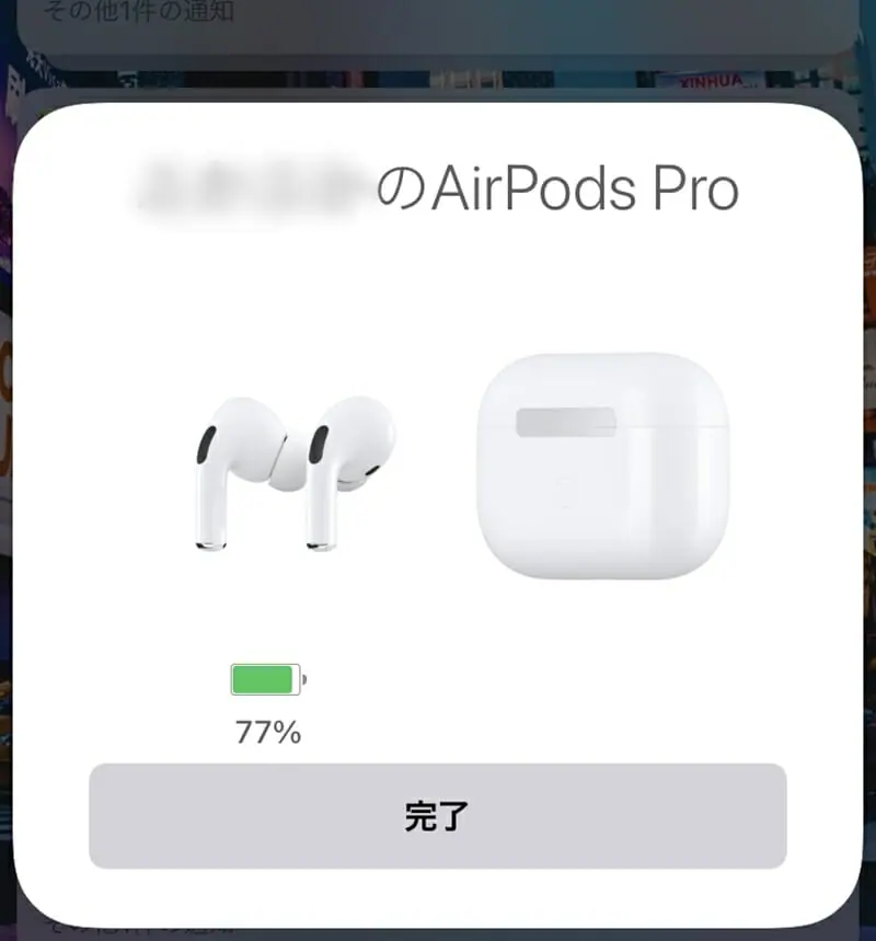 イヤホンを収納した状態でワイヤレスチャージケースのフタを開くと、自動的に最寄りのiPhoneが認識され、画面上に "AirPods Pro” の接続ボタンが表示される。