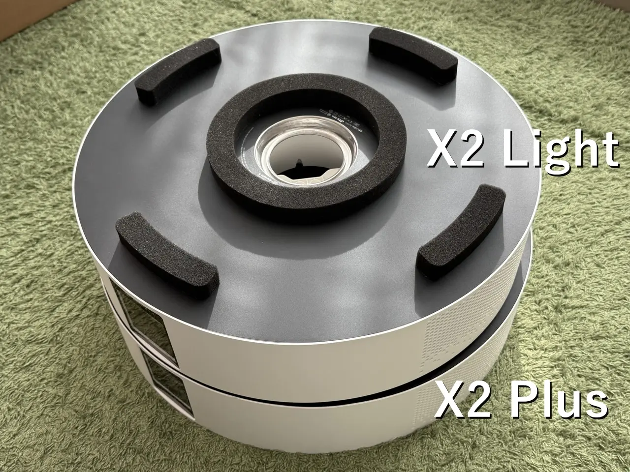Aladdin X2 Lightの筐体サイズは約456(幅)x 121(高さ)mm、Aladdin X2 Plusは476(幅)x 145(高さ)mmであり、Aladdin X2 Plusの方が20mmほど直径が大きい。