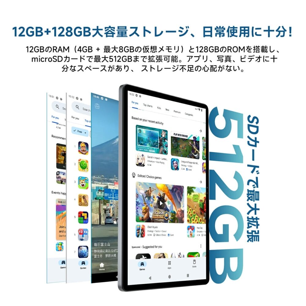 CPU(SoC)にはUNISOC T606 オクタコアプロセッサーを、RAMは4GBを採用。一般的なタブレット用途は問題なくスムーズにこなせるだけの性能を擁している。最大8GBの仮想RAM拡張が可能で、よりスムーズなタブレット操作を楽しめるようになる。