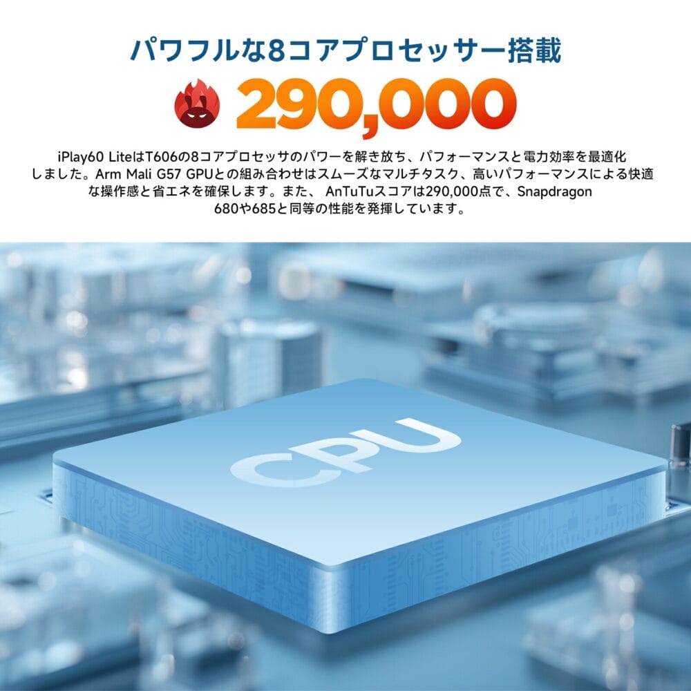 | CPU(SoC) | UNISOC T606 オクタコアプロセッサー |