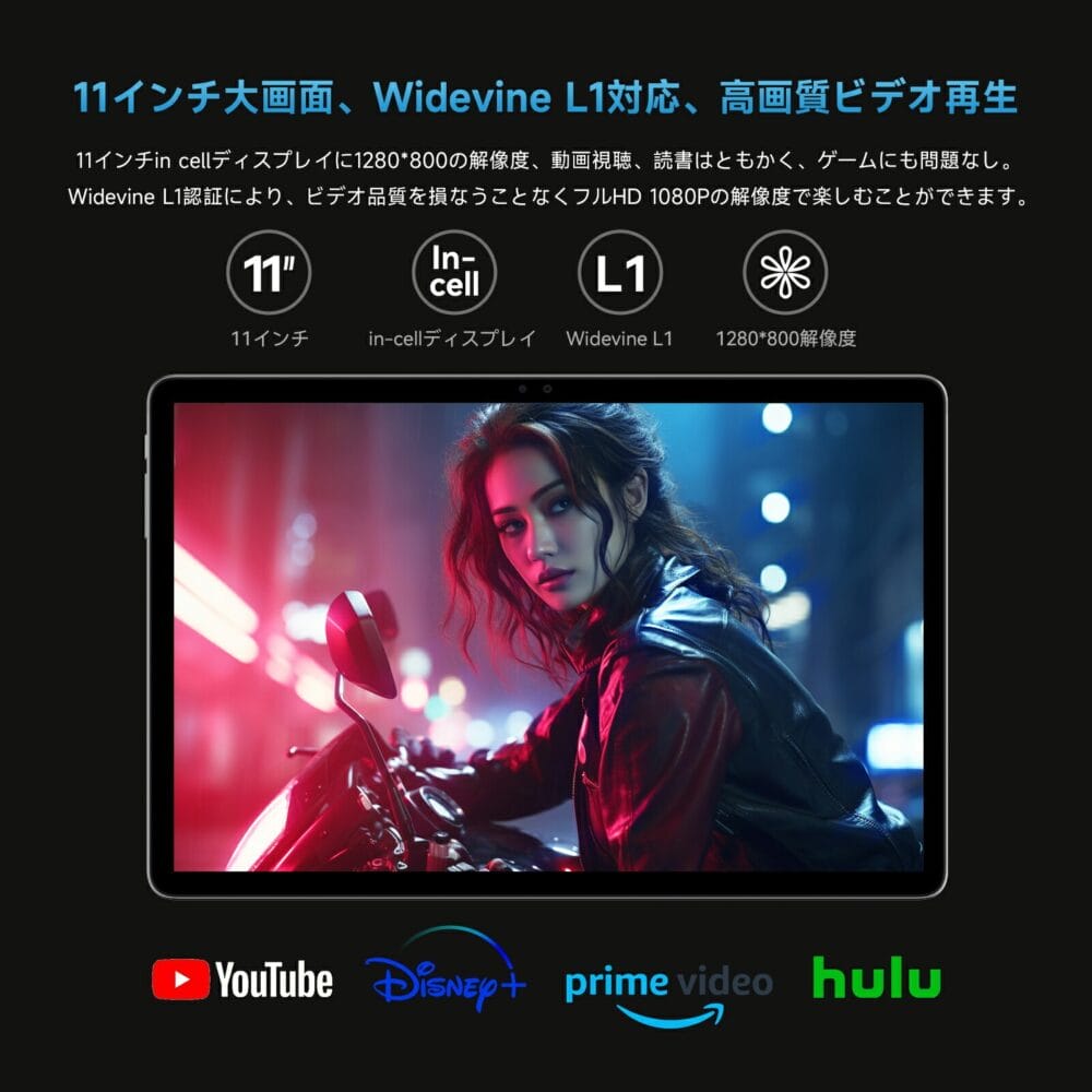 10.95インチ、1,280×800(HD+)解像度に対応したIPSパネルのディスプレイを搭載。鮮明でカラフルな映像を楽しむことが出来る。WidevineはL1サポートとなっており、HuluやAmazon Primeビデオなどの配信サービスにおいて高画質設定の映像を楽しめる。