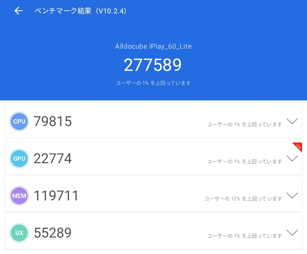 本機について、スマホ・タブレット端末の性能を測ることのできる『AnTuTuベンチマークテスト』を実施してみた。