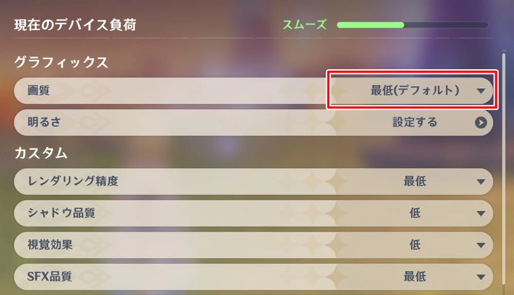 ▼画質設定はデフォルト状態で "最低" に設定されており、デバイス負荷は "スムーズ" の状態。